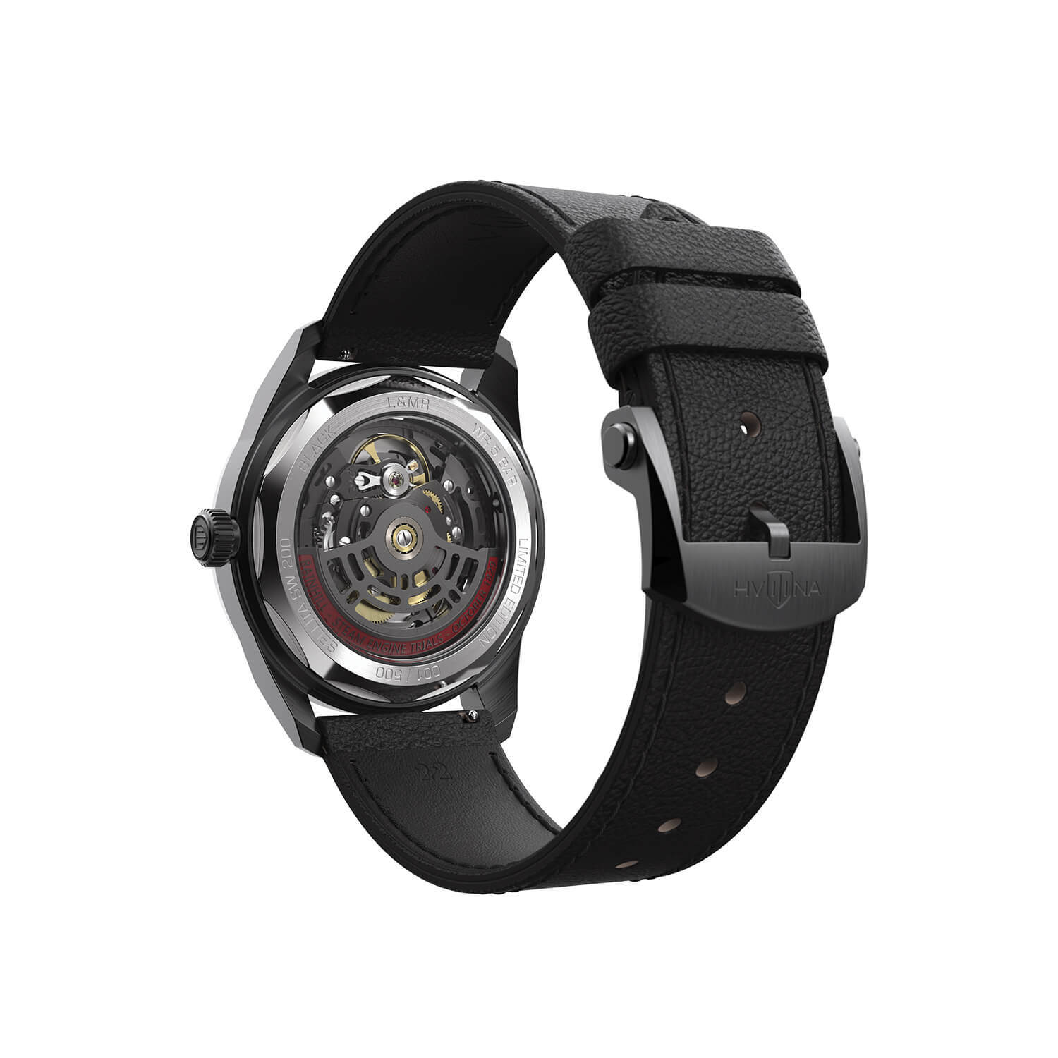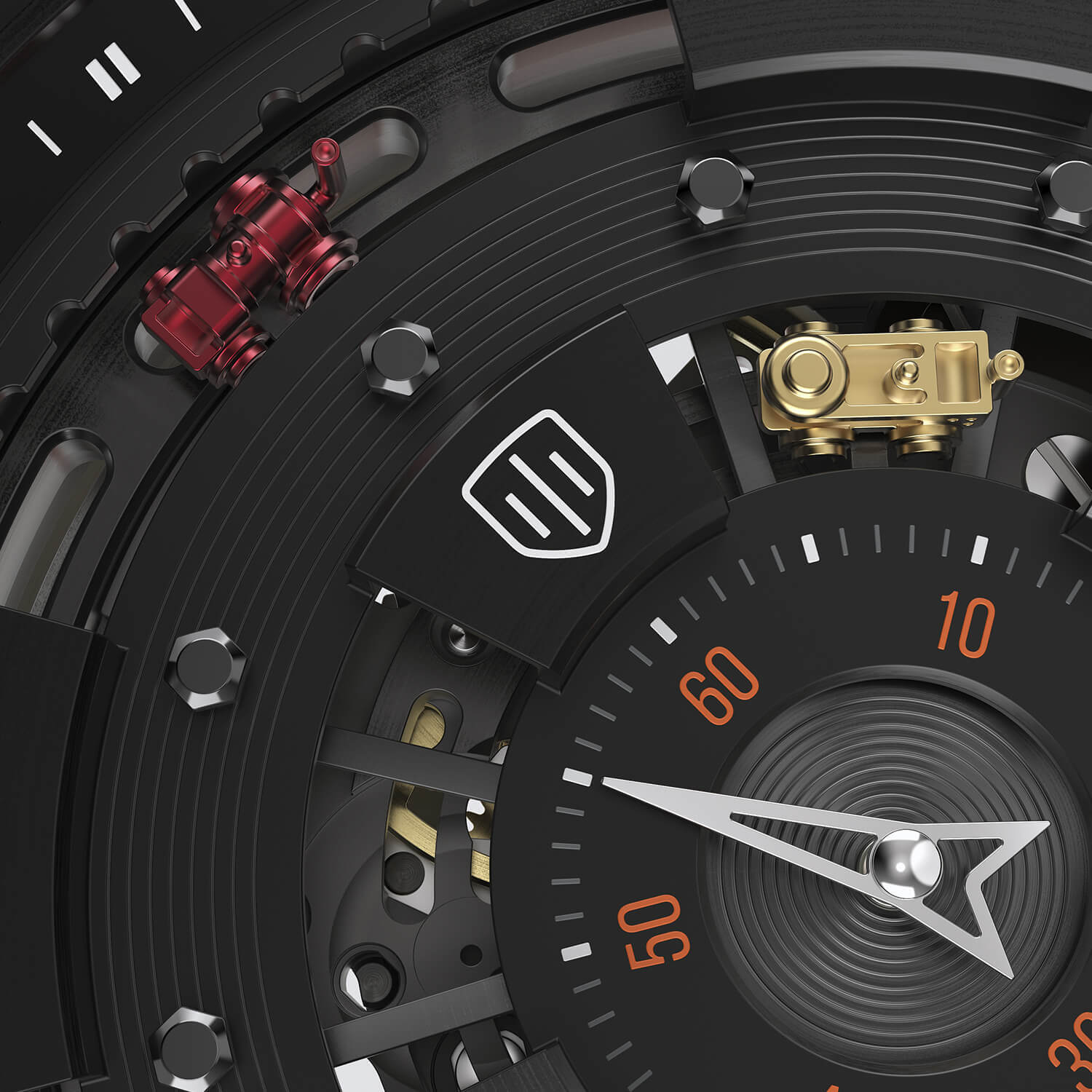 Задняя крышка моделей выполнена из нержавеющей стали в индустриальном стиле. Прозрачная центральная часть из сапфирового стекла демонстрирует работу механизма. Дизайн кастомизированного сектора механизма выполнен в виде паттерна, повторяющего элементы скелетонизированного циферблата; нижняя часть декорирована гравировкой.