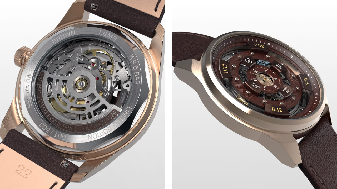 Distinctive features of the L&MR Rainhill Trials timepieces include meticulously crafted three-dimensional locomotive-shaped hands made of metal. These stylized miniature trains are powered by a Sellita SW200 customized Swiss automatic movement, visible through the intricate skeletonized dial.