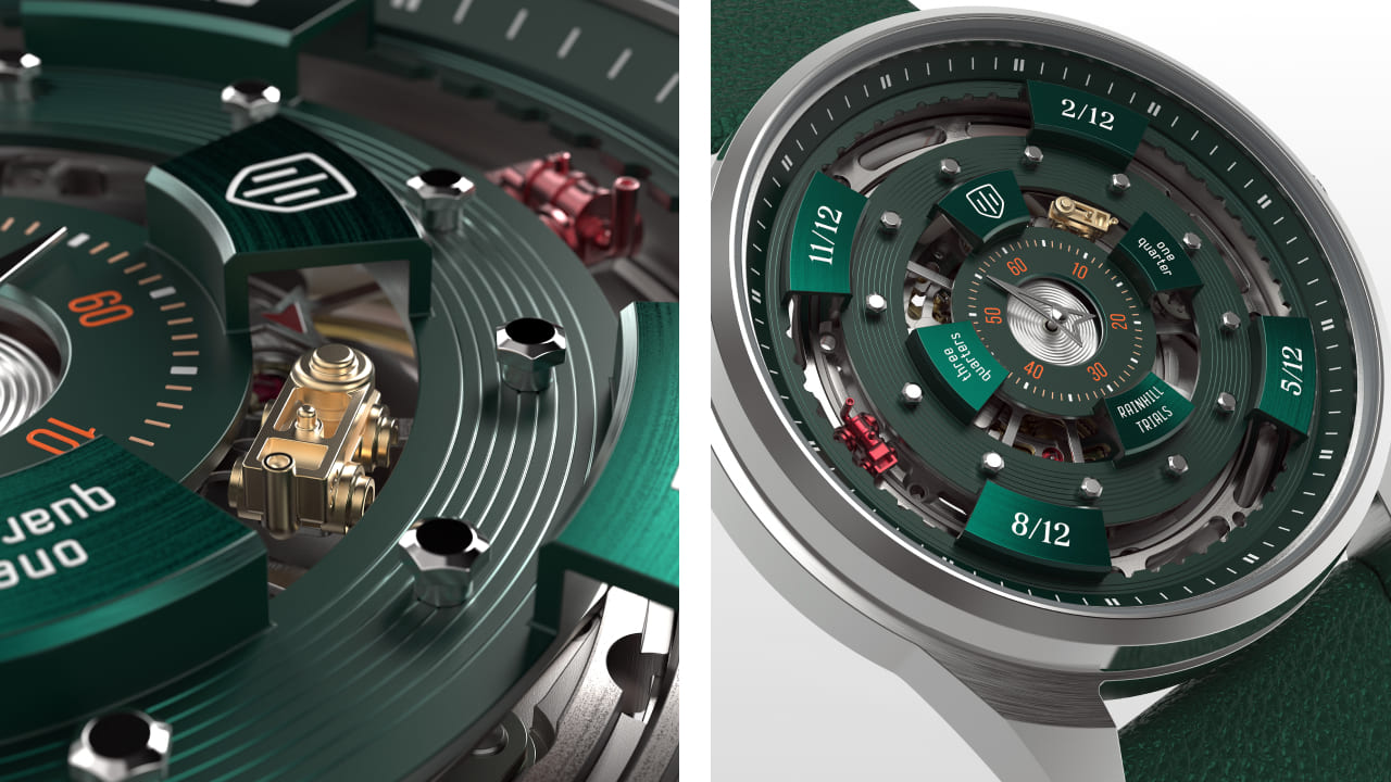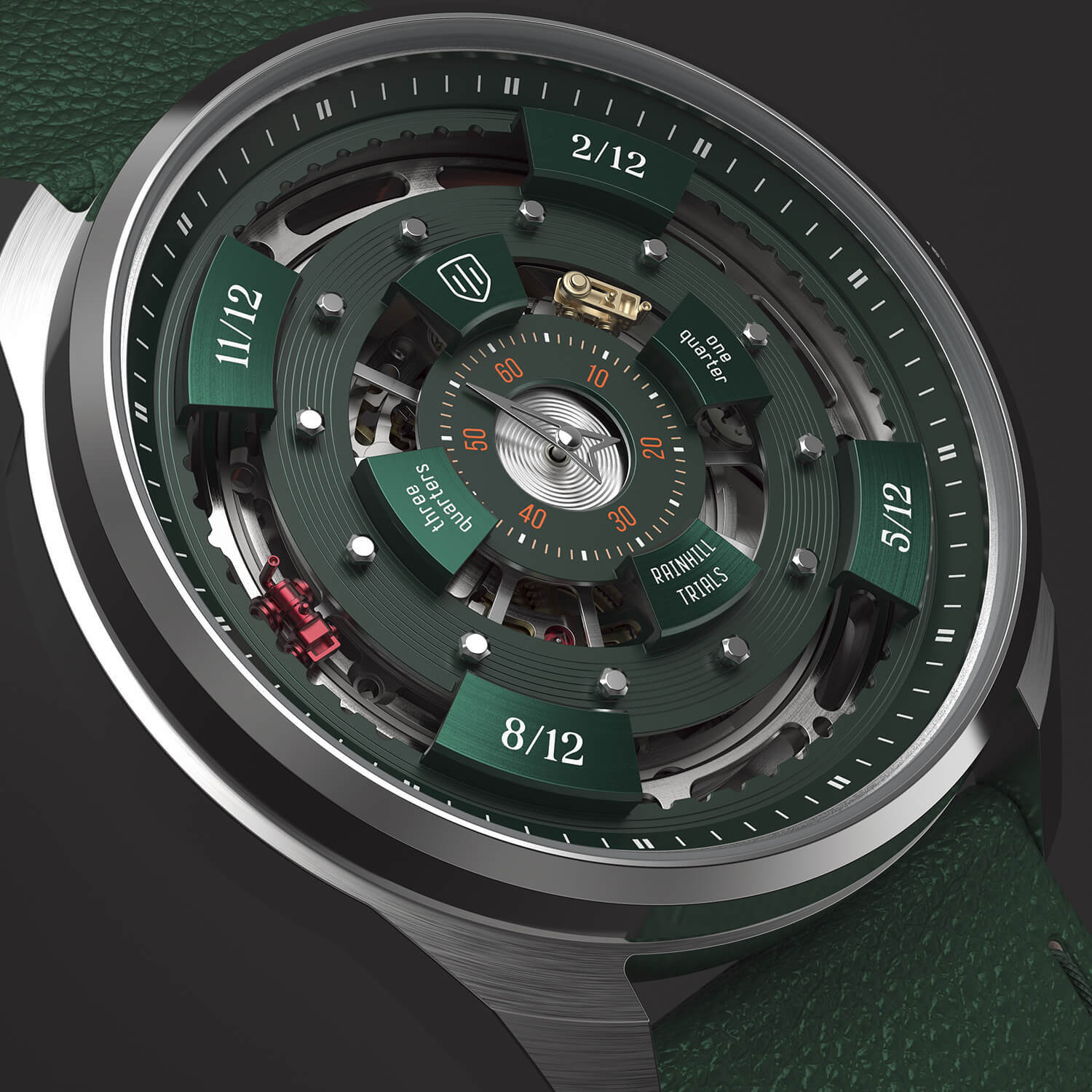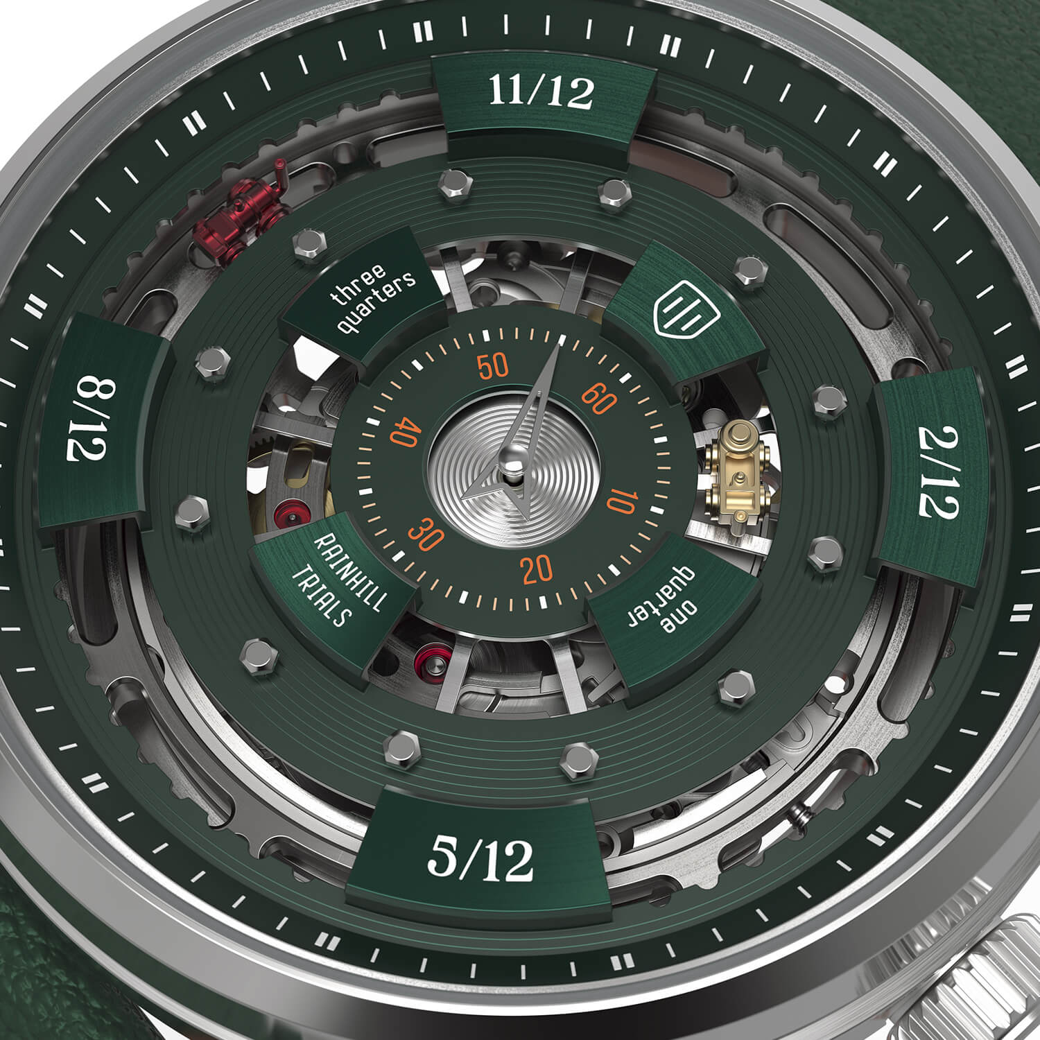 Отличительными особенностями коллекции L&MR Rainhill Trials являются трехмерные детализированные стрелки-локомотивы, выполненные из металла. Стилизованные паровозы приводятся в движение кастомизированным швейцарским механизмом Sellita SW200 с автоподзаводом, который можно наблюдать через сложный скелетонизированный циферблат