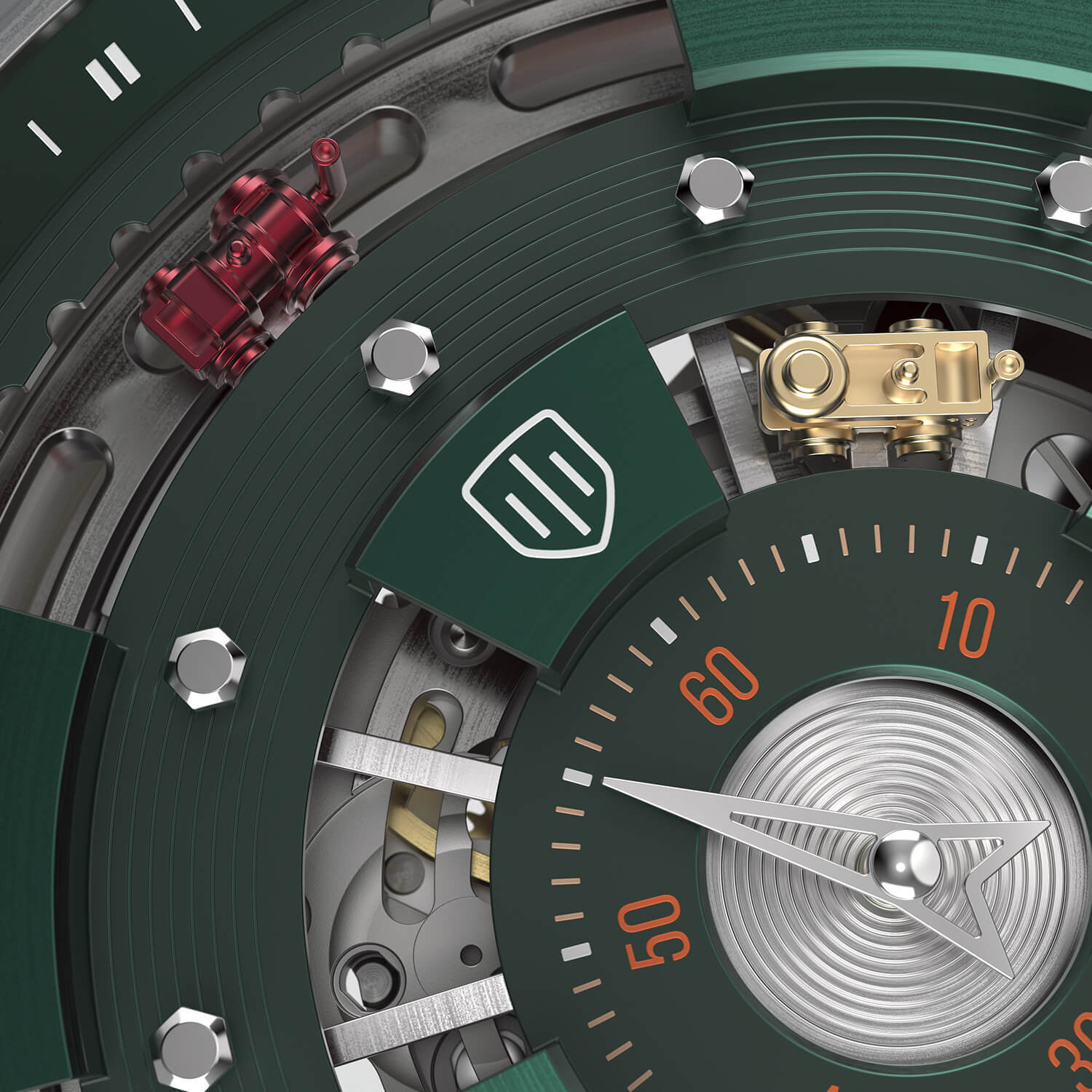 Задняя крышка моделей выполнена из нержавеющей стали в индустриальном стиле. Прозрачная центральная часть из сапфирового стекла демонстрирует работу механизма. Дизайн кастомизированного сектора механизма выполнен в виде паттерна, повторяющего элементы скелетонизированного циферблата; нижняя часть декорирована гравировкой.