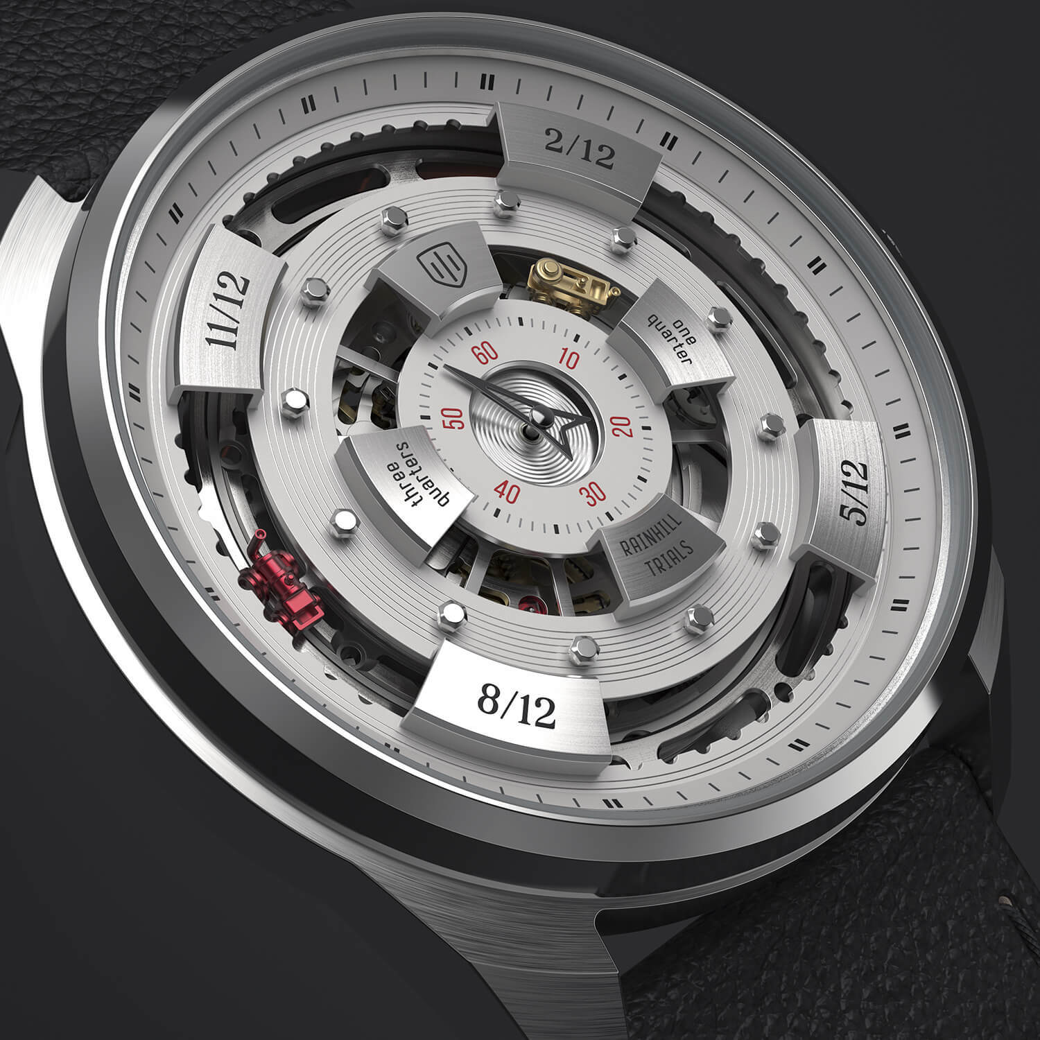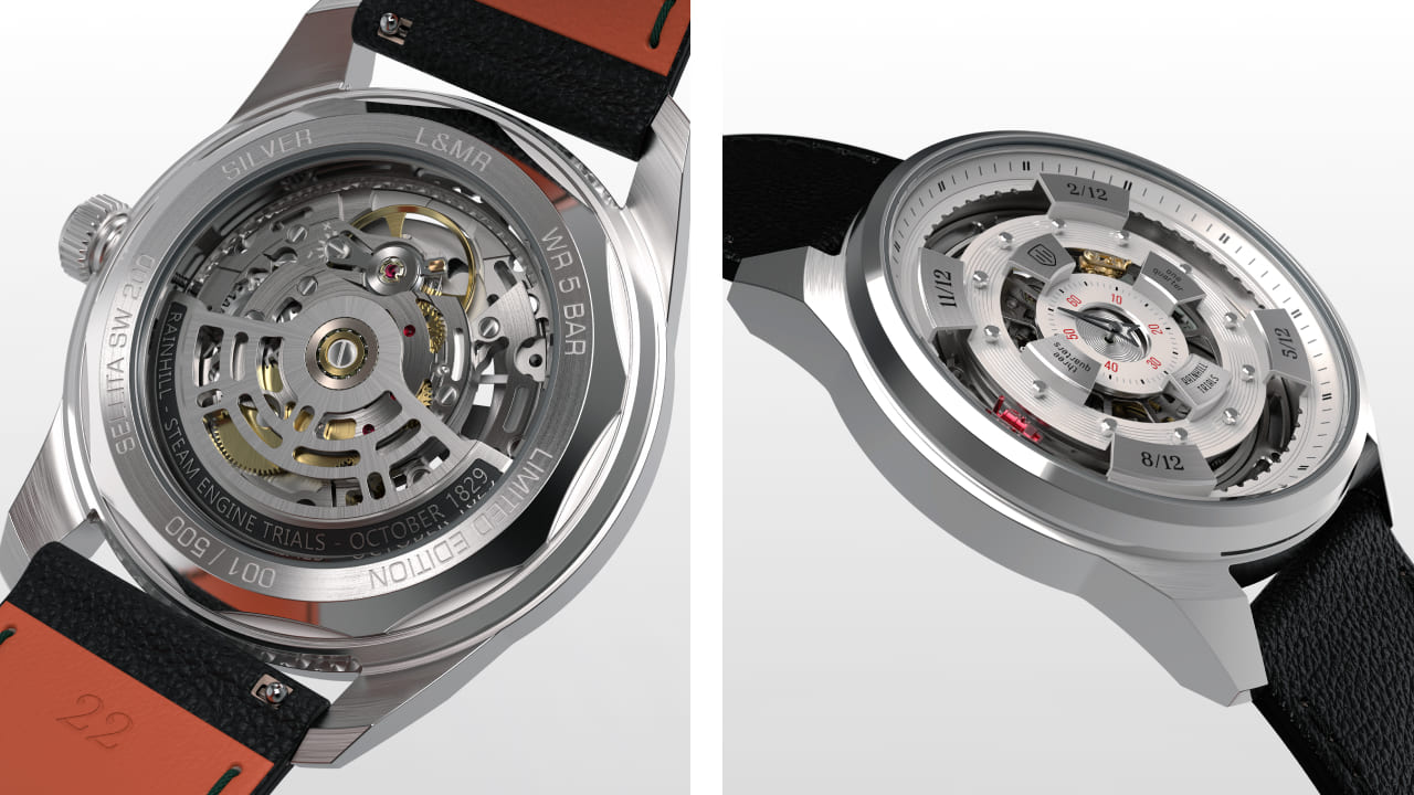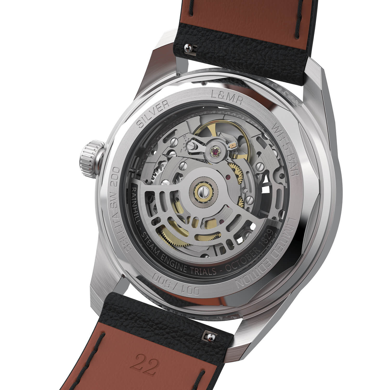 Отличительными особенностями коллекции L&MR Rainhill Trials являются трехмерные детализированные стрелки-локомотивы, выполненные из металла. Стилизованные паровозы приводятся в движение кастомизированным швейцарским механизмом Sellita SW200 с автоподзаводом, который можно наблюдать через сложный скелетонизированный циферблат
